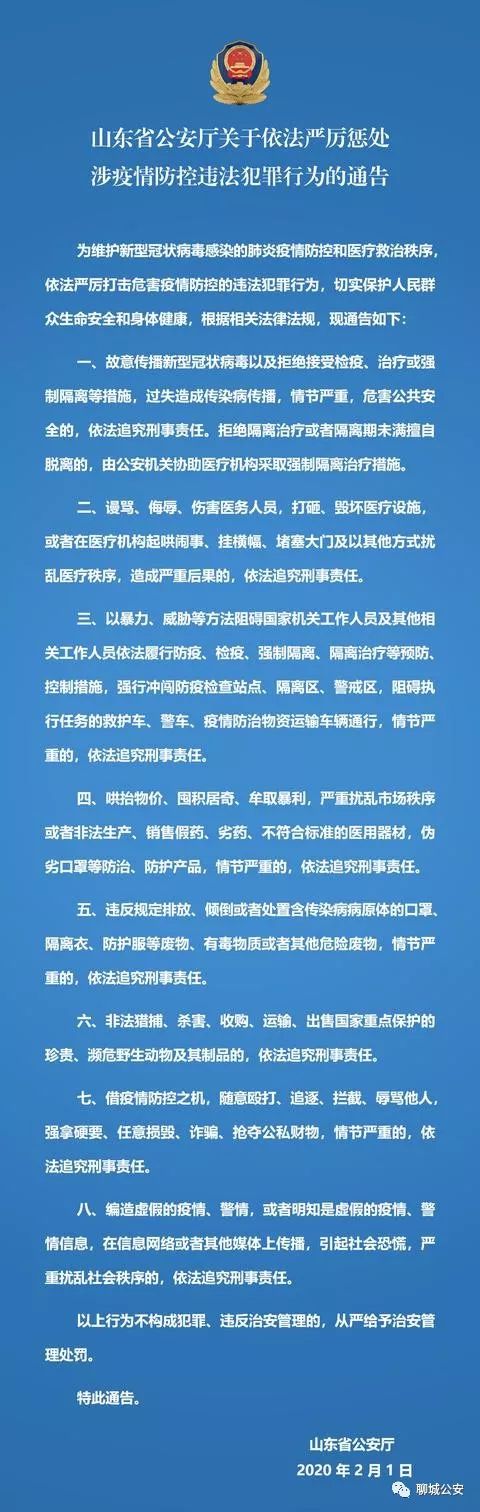 为维护新型冠状病毒感染的肺炎疫情防控和医疗救治秩序,依法严厉打击危害疫情防控的违法犯罪行为,切实保护人民群众生命安全和身体健康,根据相关法律法规,现通告如下: